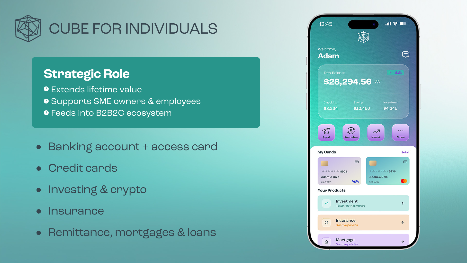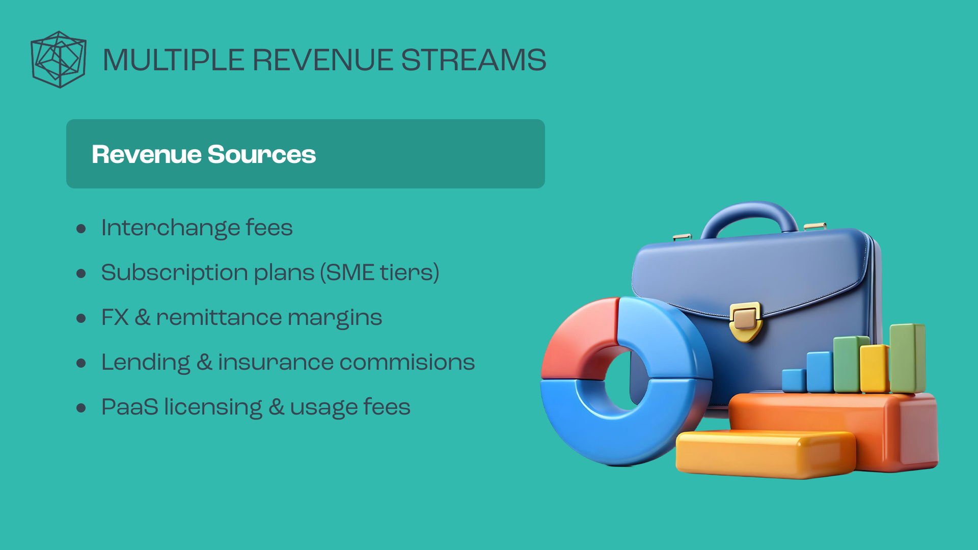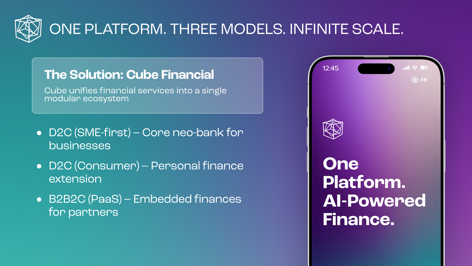 For Cube Financial Group, the objective was to establish a forward-looking brand identity that clearly communicates a complex, multi-layered fintech offering. The solution was a modular logo system built around three interlocking cubes, representing consumer banking, business solutions, and B2B Platform-as-a-Service, unified into a single AI-driven ecosystem. The geometric form reinforces stability and trust, while its multi-dimensional structure signals innovation and scalability. The identity was delivered as a flexible logo system optimized for digital and mobile use, alongside a PowerPoint investor template designed to support clear, confident storytelling for fundraising and growth.