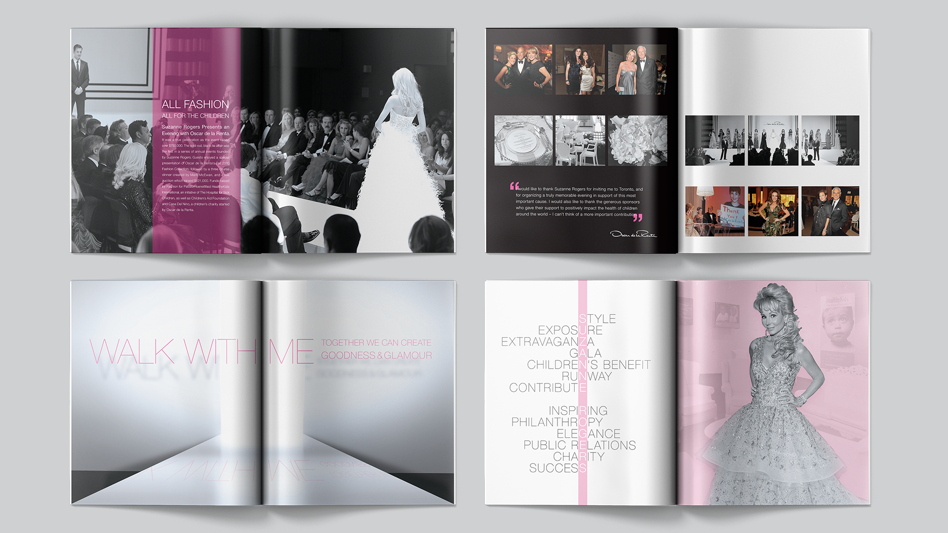 For "An Evening with Oscar de la Renta", the objective was to create a commemorative fundraiser book that reflected both the glamour of haute couture and the compassion behind the cause. Designed to support Suzanne Rogers’ charitable vision, the book marked Oscar de la Renta’s first full runway show in Canada while raising awareness and funds for children’s health initiatives. Through the use of semi-translucent pages layered over runway imagery, the design created a sense of elegance and movement, blending fashion storytelling with the emotional purpose of the event.